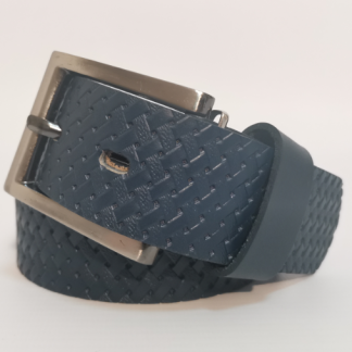 CORREA EN CUERO COLOR AZUL CON ESTAMPADO DECORATIVO.