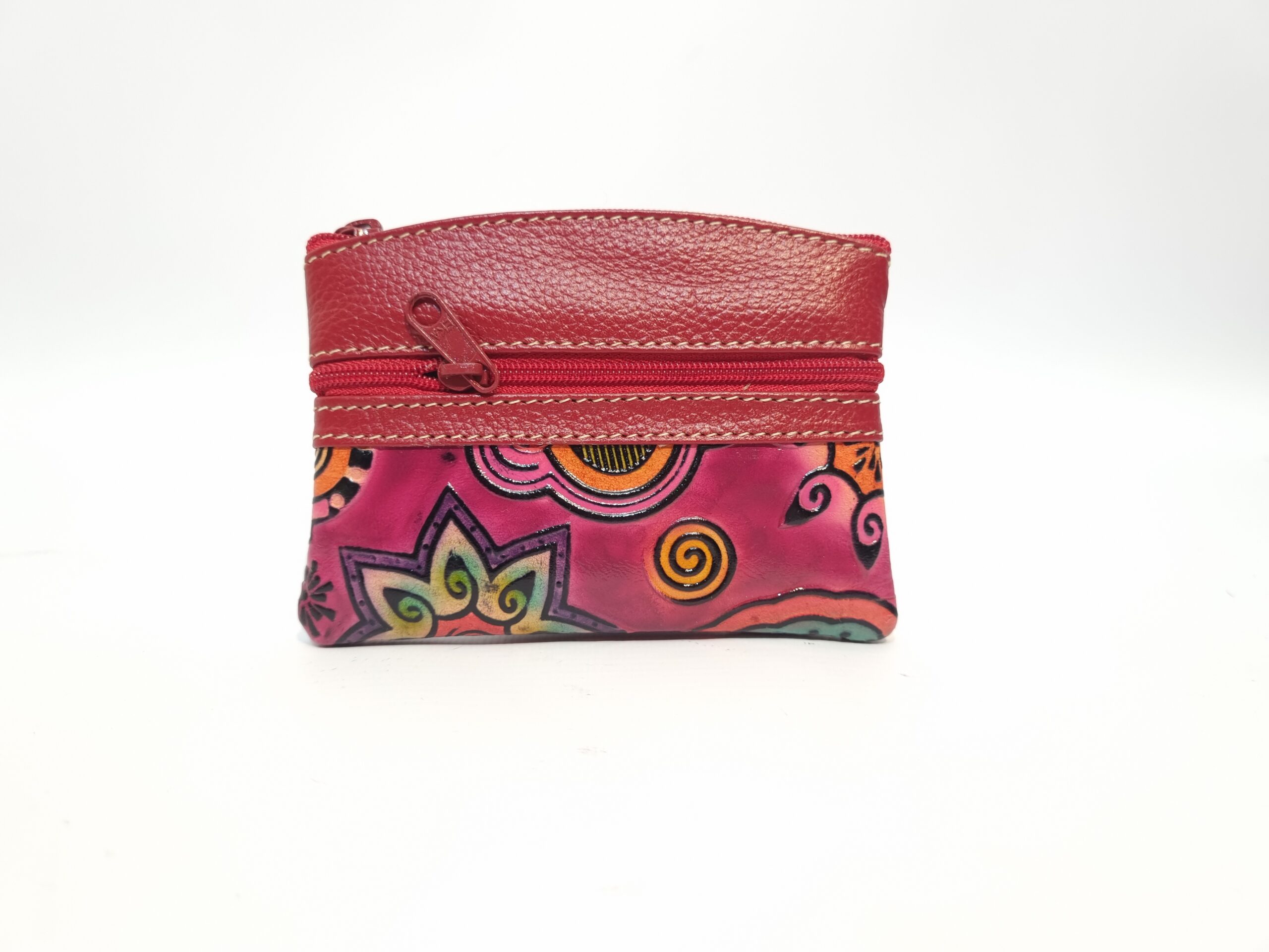 Monedero en cuero pintados a mano, cuenta con dos bolsillos amplios con cremallera y decoraciones a mano.