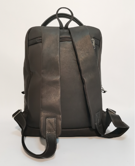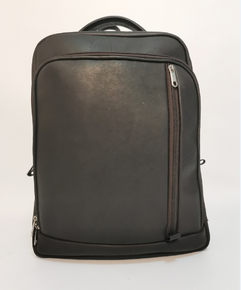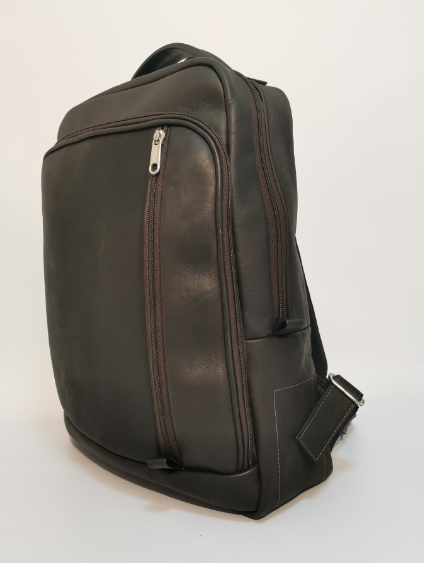 Maleta en cuero con cuatro bolsillos con cremallera de seguridad, división interna para portátil y cargaderas regulables. Decoración en hilo fino.