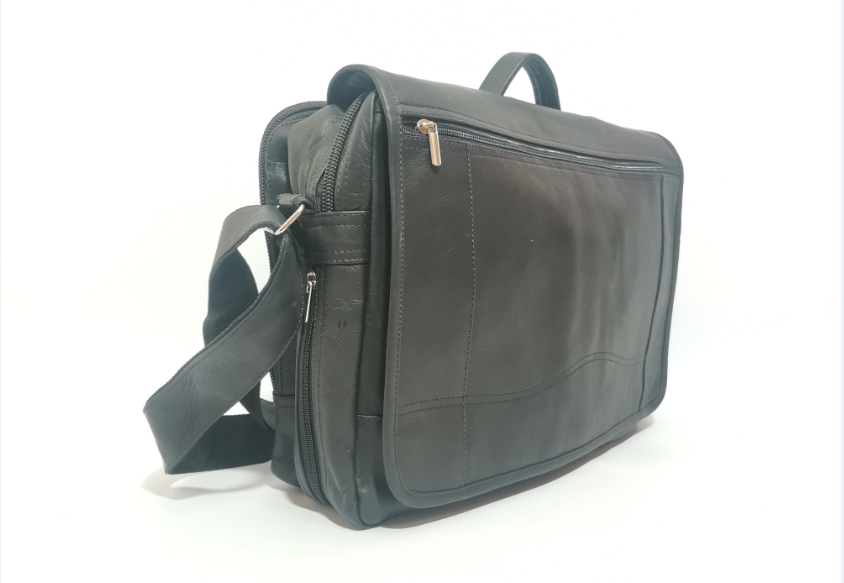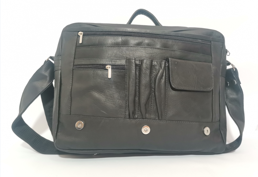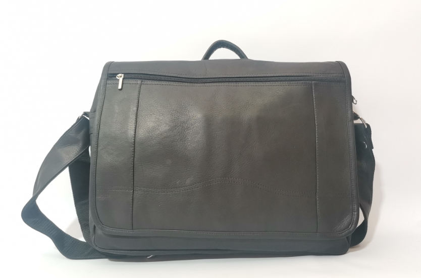 Maletín amplio en cuero con seis bolsillos con cremalleras de seguridad, cargadera regulable, división interna para portátil y costuras decorativas en hilo fino.
