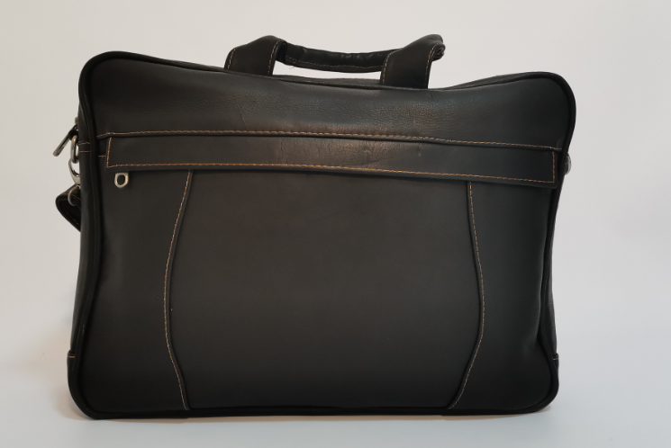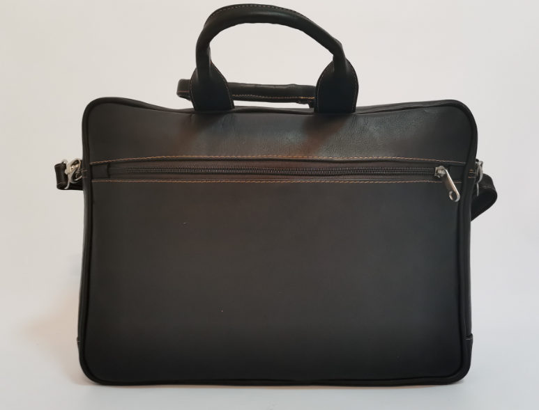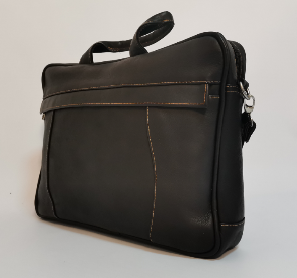 Maletín en cuero con tres bolsillos con cremalleras de seguridad, cargadera regulable, división interna para portátil y costuras decorativas en hilo fino.